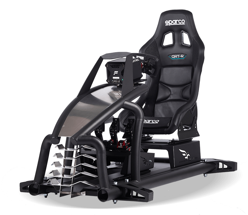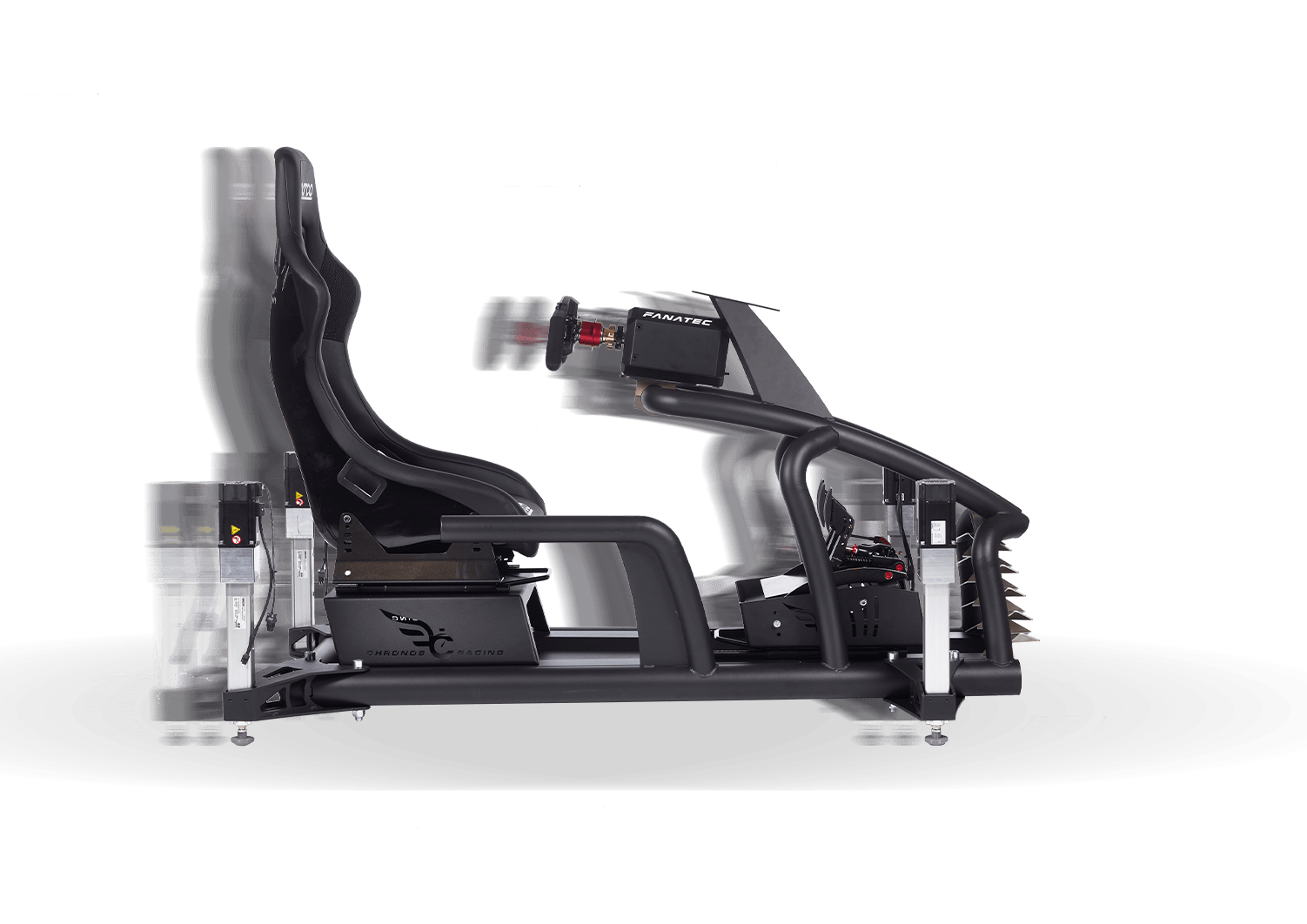 Onze simulator beschikt over een volledig in huis ontwikkeld motion systeem. Hiermee kunnen we drie bewegingen (3DOF) simuleren: ‘heave’ (opwaarts en neerwaarts), ‘roll’ (zijdelinks kantelen) en ‘pitch’ (voorwaarts kantelen). Met deze bewegingen hebben we voldoende om het volledige spectrum aan krachten op een racewagen te simuleren.